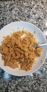 • Posteriormente añadir la quinoa y los garbanzos al vaso de la picadora para triturarlos hasta que quede un aspecto de puré.  Si os cuesta triturarlos, podéis ir añadiendo un poco de agua. Pero…¡Cuidado en excederos con el agua! Correréis el riesgo de que queden demasiado líquidos.